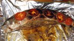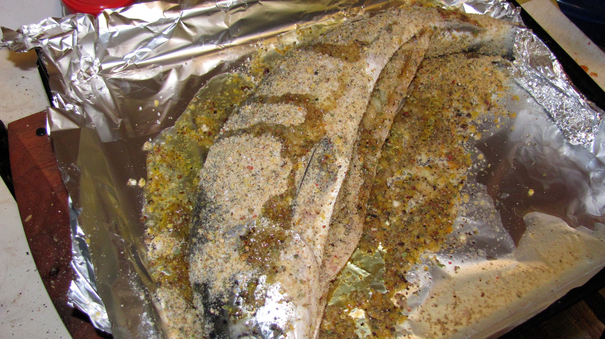 Pestele se aseaza intr-o tava, pe hartie de copt, (sau in lipsa lui pe folie de aluminiu) ii invelim coada in staniol si se stropeste cu 2 linguri ulei de masline.
