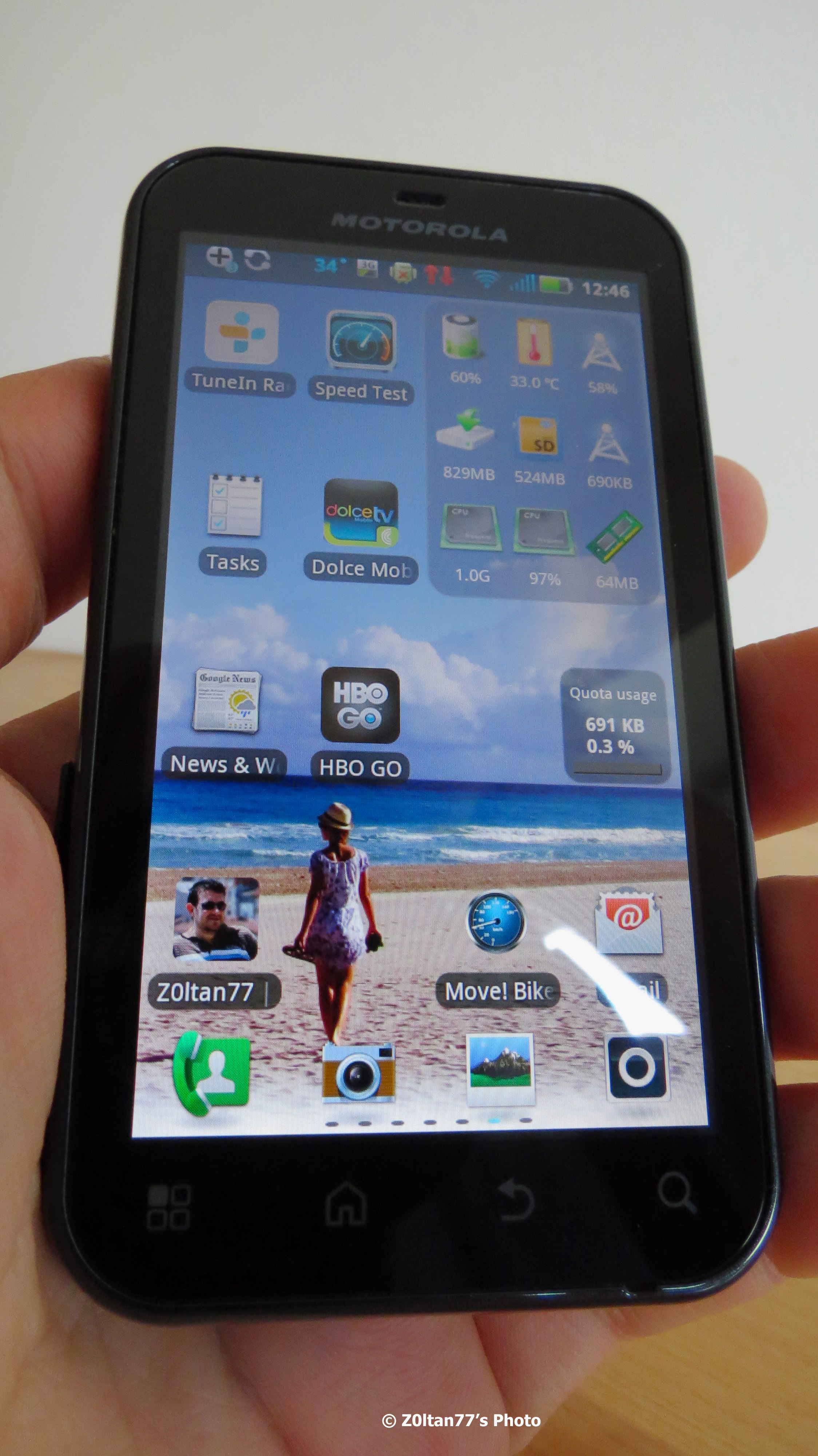 Sistemul de operare si aplicatiile: Vine direct cu Android 2.3.6 (Gingerbread) ceea ce e OK, cand ma gandesc ca Defy-ul standard l-am primit cu 2.1 (Eclair) la care ulterior a sosit doar 2.2 (Froyo) si aici cred ca s-a si oprit upgrade-ul. Vine usor personalizat de MOTOROLA cu cateva widgeturi folositoare, ai 7 ecrane pe care poti sa te intinzi cu shortcut-uri si widget-uri si spre bucuria mea vine si cu Motoblur la fel ca Atrix-ul. Motoblur, e un serviciu dedicat utilizatorilor de aparate Motorola prin care sunt unificate  conturile  de socializare (FB, Twitter si altele) pe un singur canal. Iti faci un cont pe Motoblur si acolo asociezi datele de sincronizare. Informatiile sunt trase si agregate in Motoblur, dupa care sunt trimise catre smartphone. Mie personal imi place altii sunt impotriva lui, gusturile nu se discuta. Ai cateva aplicatii preinstalate (printre care si un Music Player capabil) si in rest iti pui tu ce folosesti, la mine dureaza ceva pana imi instalez o mare parte din aplicatiile mele preferate. Nici unul nu se blocheaza, si IGO-ul merge fluent. Deci procesorul single-core 1 GHz Cortex-A8 impreuna cu GPU PowerVR SGX530 isi fac treaba mai mult decat decent.