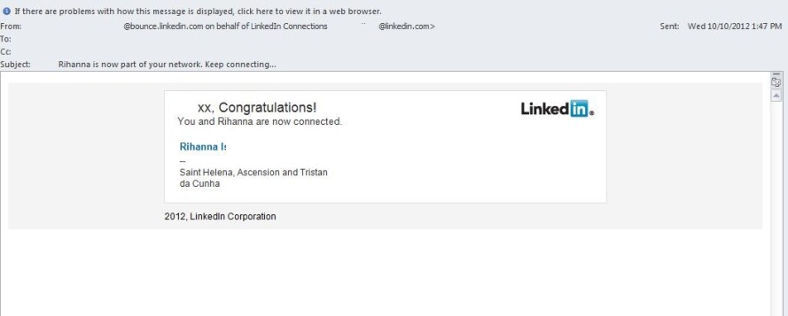 Rihanna fake LinkedIn Spam Published 18 October 2012 at 1053 × 423 in Virusii fac victime printre fanii din Romania ai Madonnei si ai Rihannei ← Previous Next →