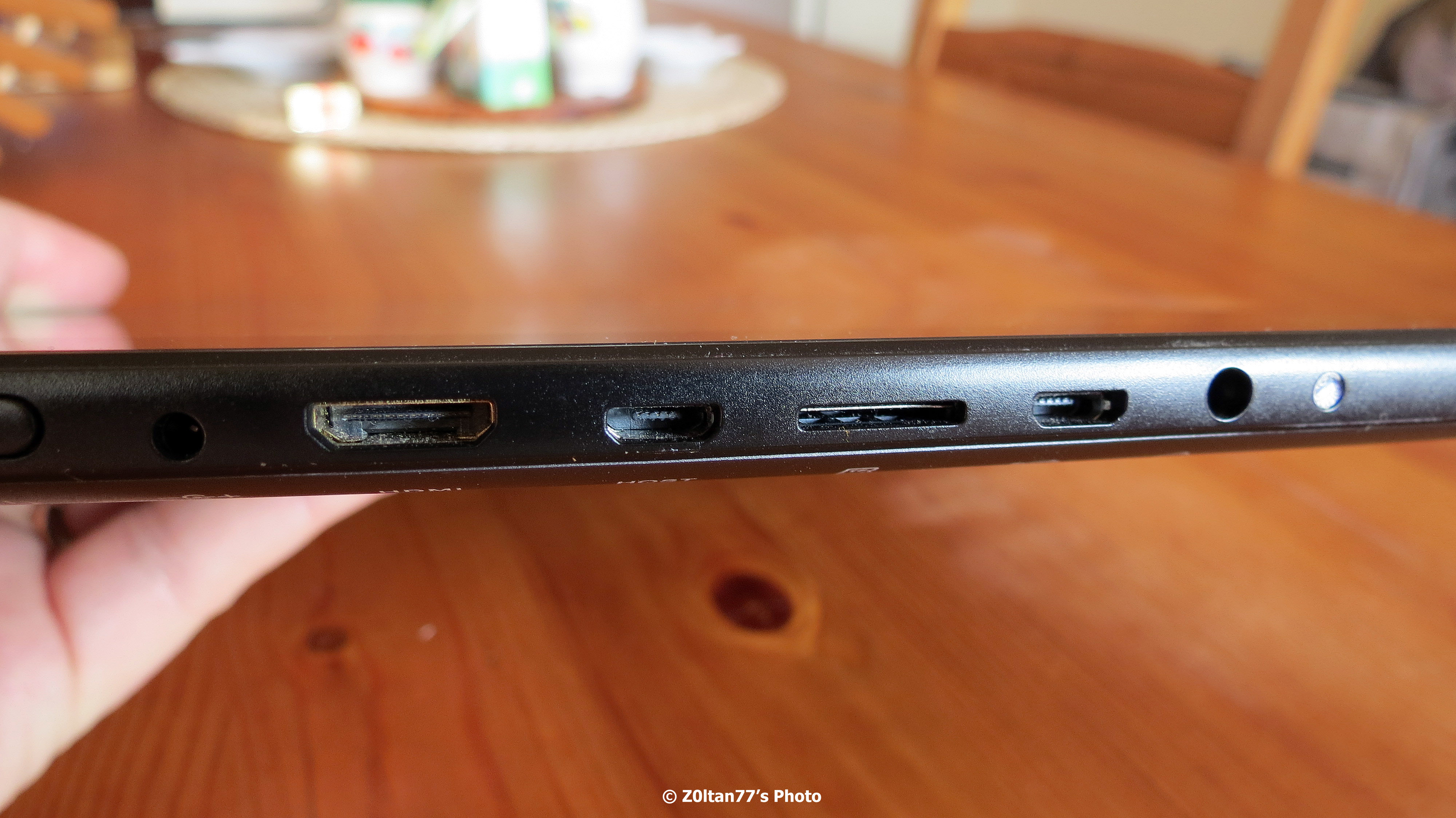 intrarea pentru casti (3,5), port USB, loc pentru microSD, HOST, HDMI, incarcare, butonul On/Off si microfonul.