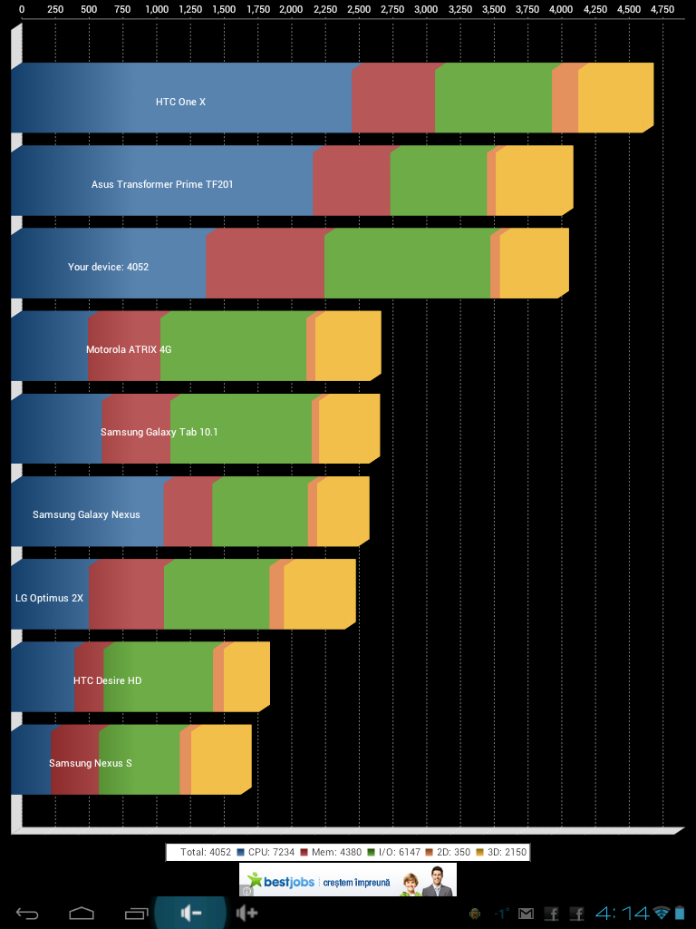 Hardware-ul, sistemul de operare si aplicatiile: Insfarsit o tableta care nu vine cu arhicunoscutul Cortex A9 ci vine cu Rockchip Dual Core 1,5 GHz ajutat de un procesor grafic capabil Mali Quad Core, deci ar trebui sa ofere o performanta peste cel al concurentei, dar in mod ciudat nu am sesizat acest plus si nici in programul de teste Quadrant n-au iesit cifre mai mari decat la tabletele concurentei. Si asta ar fi problema mai mica, dar este una un pic mai suparatoare, multe aplicatii se blocau, chiar si din Facebook iesea des, iar Antutu (celalalt program de teste ce mai folosesc) n-am reusit sa-l rulez pe el pana la capat, se bloca si puteam folosi tableta doar dupa un reset. Nu stiu ce e de vina, dar e suparator. Cateodata merge bine dar altadata merge cu blocaje nu e constant. Vine cu Android 4.04 si n-am informatii despre update.