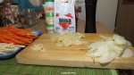 Am tocat marunt ceapa si usturoiul iar morcovii si telina (uneori mai pun si ardei) le-am taiat fasii foarte subtiri. Prazul l-am taiat rondele si am pastrat jumatate pentru ornare la sfarsit.
