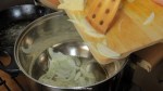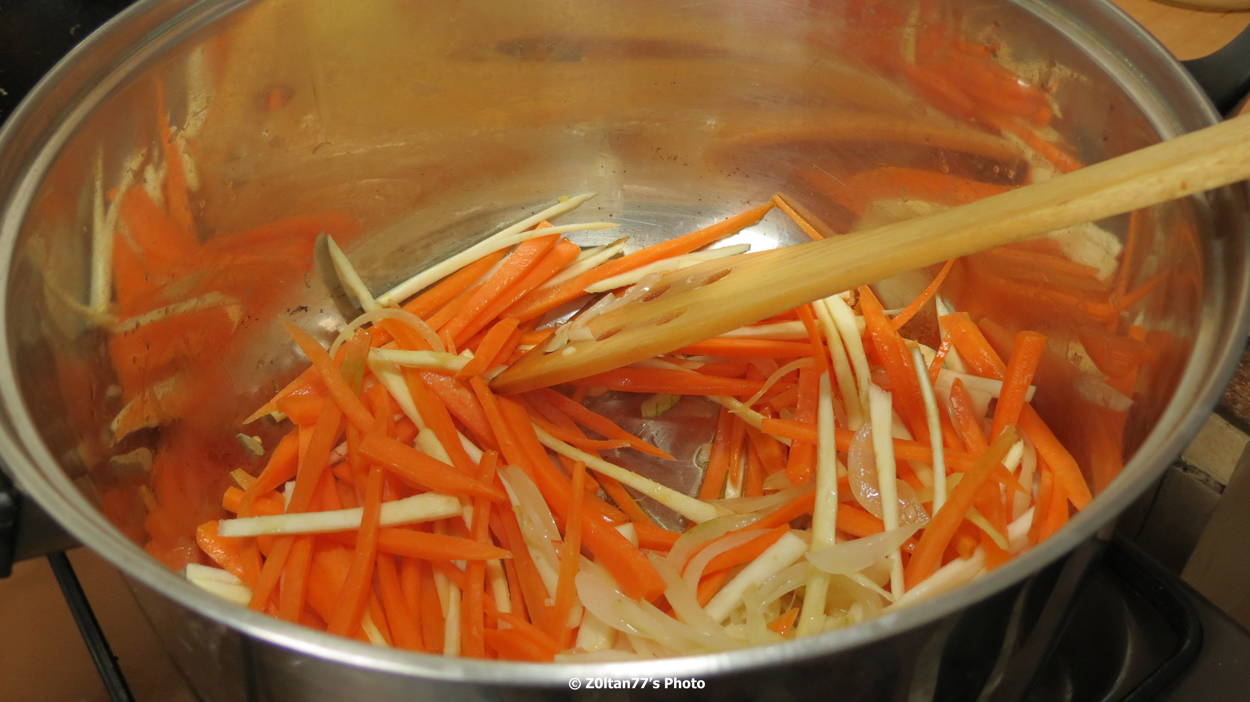 Am calit in putin ulei de masline (pentru gatit) usturoiul, ceapa, morcovii, telina si parte din praz pana cand s-au inmuiat – aproximativ 3 minute.