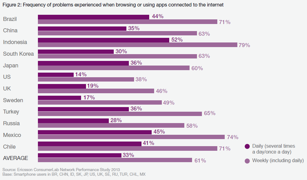 Un nou studiu Ericsson (NASDAQ: ERIC) ConsumerLab arata ca performanta retelei este cruciala pentru a asigura loialitatea utilizatorilor de smartphone-uri si pentru a avea un avantaj competitiv pe piata de telecom. Rezultatele studiului indica faptul ca majoritatea utilizatorilor de smartphone-uri nu sunt satisfacuti de retelele pe care le folosesc in prezent. Astfel, 60% dintre utilizatori declara ca intâmpina probleme de retea cel putin o data pe saptamâna, iar 30% declara ca intâmpina probleme zilnic.