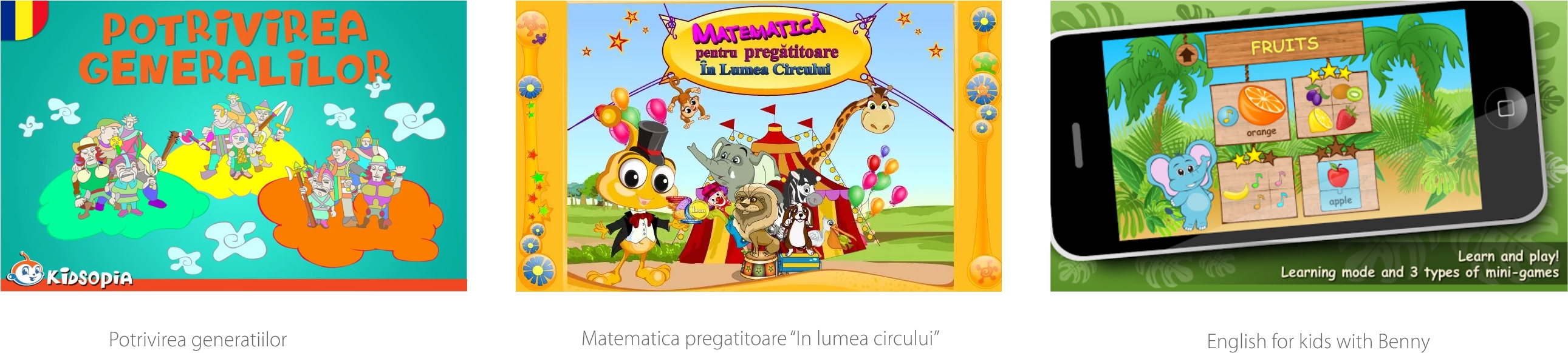 Un exemplu de acest tip este aplicatia Learn and Play, prin intermediul careia cei mici pot invata cum se pronunta anumite cuvinte in limba engleza, cu ajutorul reprezentarilor grafice. De asemenea, aplicatia English for kids with Benny, in care un personaj animat ii ajuta pe copii sa invete cuvinte de baza, cu ajutorul imaginilor, este un alt mod distractiv de a invata limba engleza.
