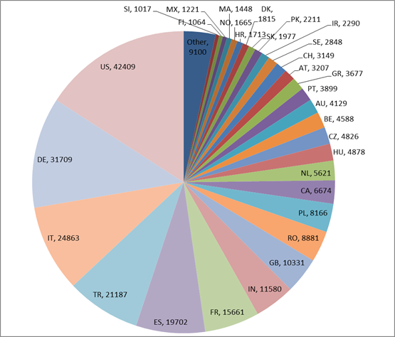 Distributia geografica a descarcarilor indica faptul ca cele mai multe dintre ele au avut loc in SUA: