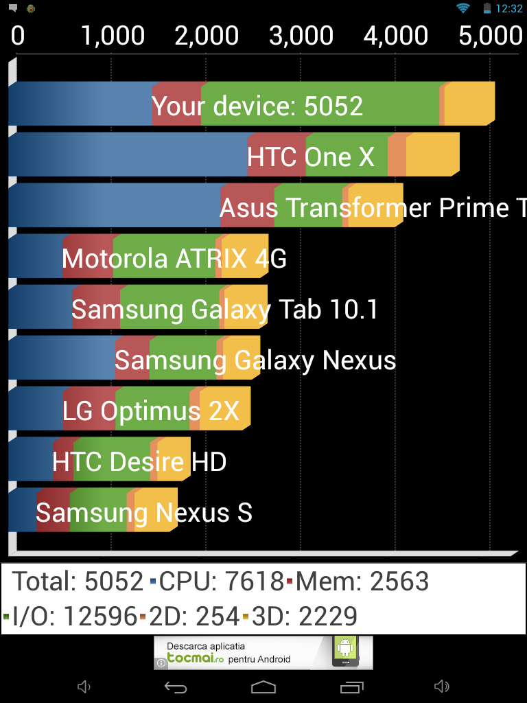 In benchmarkuri a obtinut urmatoarele punctaje: in Quadrant 5052, in Antutu 20945, in GeekBench 3 274/773 iar in 3D Mark Ice Storm Extreme 2701, ceea ce nu e rau, e chiar peste multe alte tablete din aceasta categorie. Tableta vine cu Android 4.2.2, deci e in regula.
