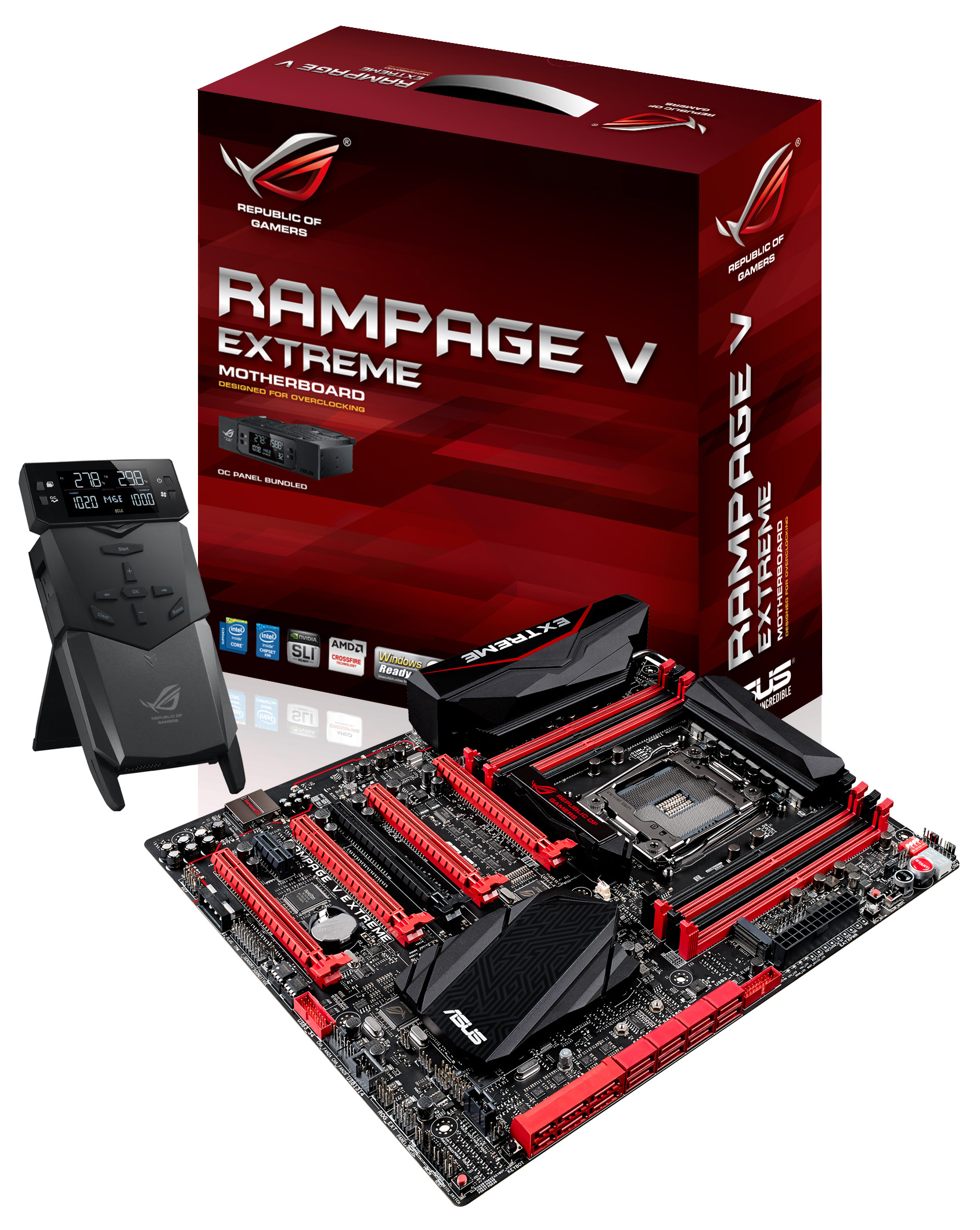 ROG intelege pasionatii de overclocking mai bine decat orice alt producator, astfel ca Rampage V Extreme integreaza noile butoane hardware Safe Boot si ReTry ce ajuta la restabilirea setarilor atunci aventura de overclocking nu a mers cum trebuie. Noua placa include, de asemenea, OC Panel, sistemul de reglaj si monitorizare in timp real de la ROG, un accesoriu obligatoriu pentru toti pasionatii de overclocking. Instalat intr-un sertar de 5.25 inci, OC Panel are un ecran de 2.6 inci, clar si luminos, ce ofera monitorizarea in timp real a parametrilor vitali, incluzand temperatura procesorului, rata de multiplicare, frecventa de baza si vitezele ventilatoarelor. Butonul CPU Level Up furnizeaza un control instant pentru overclocking in doua trepte, in timp ce viteza ventilatoarelor poate fi ajustata in modurile: Turbo, Standard si Silent – toate fiind usor accesibile. Alternativ, OC Panel functioneaza ca o consola externa de overclocking. In acest mod, exista trei conectori si comutatori pentru functiile exclusive ROG incluzand: Subzero Sense, VGA SMB, VGA Hotwire, Slow Mode si Pause. OC Panel ofera acces la un conector cu patru pini pentru ventilator precum butoanele pentru pornit/oprit si reset.