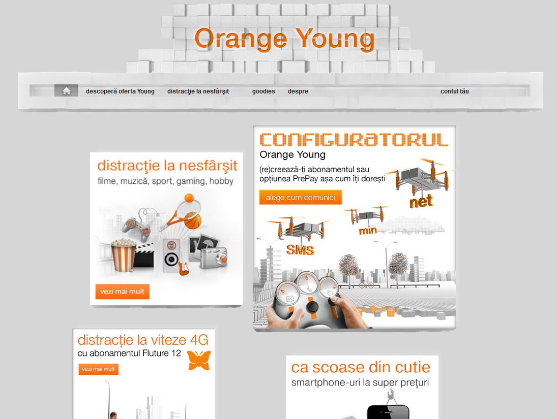 Incepand de astazi, clientii cu varste cuprinse intre 18 si 35 de ani au la dispozitie configuratorul Orange Young, o oferta disponibila exclusiv online, prin care isi pot crea sau modifica propriul abonament, Orange fiind singurul operator telecom care ofera acest serviciu in Romania. Din studiile de piata efectuate si din interactiunile cu clientii, a reiesit in mod constant ca tinerii isi doresc mai multa flexibilitate si control in alegerea si modificarea resurselor, mai ales in cazul internetului mobil de mare viteza.