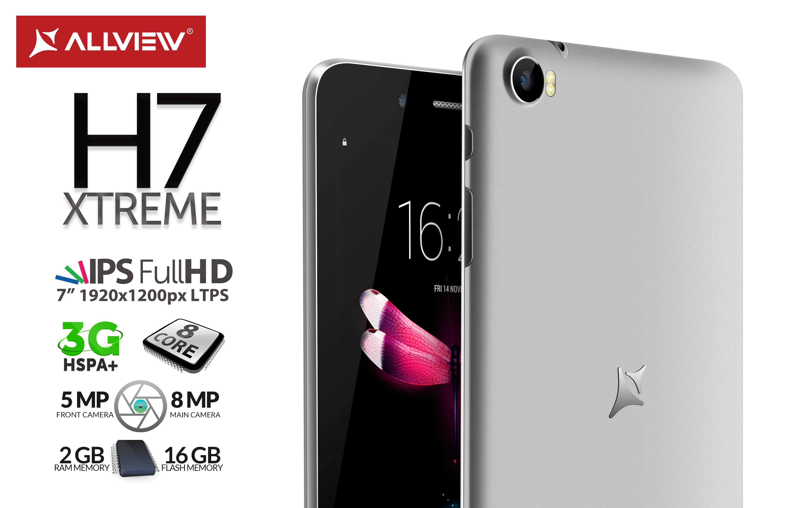 Allview lanseaza astazi tableta Viva H7 Xtreme Device-ul se remarca prin procesorul Octa Core, memoria RAM de 2 GB, display-ul IPS de 7” cu rezolutie Full HD, camere cu rezolutii de 8 MP si 5 MP, GPS si conectivitate 3G integrata.