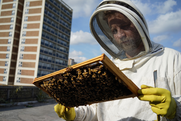 Beekeepers Chris Barnes (dark hair) and Paul Webb of Barnes and Webb inspect their hives on top of The Red Gallery, Shoreditch, East London. This is the final hive inspection to check for disease or problems before the hives are shut up for winter for the bees hibernation.