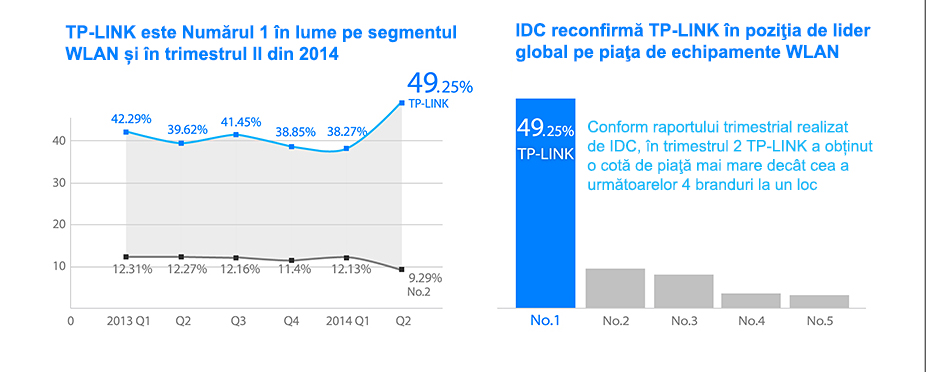 Conform raportului trimestrial realizat de IDC (Worldwide Quarterly WLAN Tracker), in T2, TP-LINK este compania cu cea mai mare cota de piata (masurata pe baza unitatilor vandute):