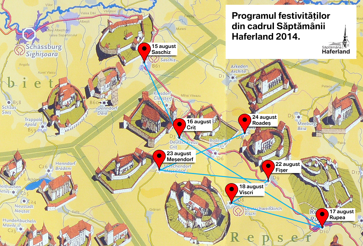 Festivalul Saptamana Haferland include astfel satele sasesti din zona cuprinsa intre Rupea si Sighisoara, astfel ca turistii au avut sansa de a vizita localitatile Fiser, Saschiz, Viscri, Crit, Mesendorf si Roades.